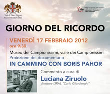 In occasione del Giorno del Ricordo venerdì 17 febbraio 2012 alle ore 9.30 presso il Museo dei Campionissimi a Novi Ligure, viale dei Campionissimi, proiezione del documentario “In cammino con Boris Pahor“