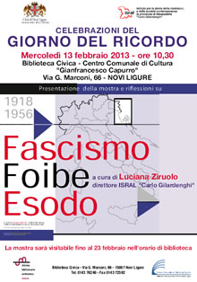 Mercoledì 13 febbraio 2013 in occasione del Giorno del Ricordo alle ore 10.30 presso la Biblioteca Civica – Centro Comunale di Cultura “Gianfrancesco Capurro” in Via G. Marconi, 66 a Novi Ligure presentazione della mostra e riflessioni su Fascismo, foibe, esodo.