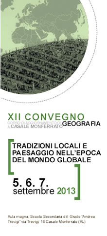 A Casale Monferrato – Aula magna, Scuola Secondaria di I Grado “Andrea Trevigi” via Trevigi, 16 il 5, 6 e 7 settembre 2013 XII Convegno – Corso di aggiornamento di geografia, Tradizioni locali e paesaggio nell’epoca del mondo globale.