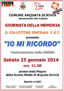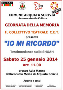 Il 25 gennaio 2014 ad Arquata Scrivia in occasione del Giorno della Memoria 2014 il Collettivo Teatrale C.E.T. presenta “Io mi ricordo, testimonianze sulla Shoah” ore 11.00 presso Aula Magna della Scuola Media di Arquata Scrivia.