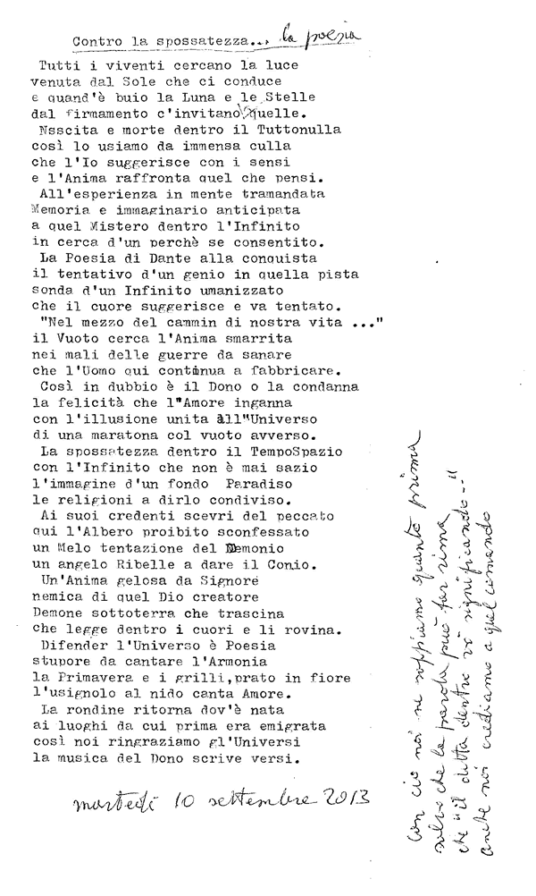 Aveva quasi 92 anni. Si spegne un grande Artista e un vero Poeta, antico e modernissimo nello stesso tempo. Oltre ad un notevole patrimonio di opere grafiche e scultoree, ci lascia un monumento poetico enorme ed eccezionale, che dovrà essere valorizzato come merita.