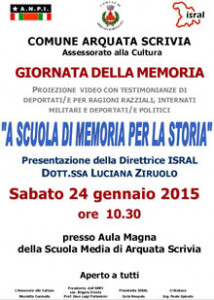 Il 24 gennaio ad Arquata Scrivia in occasione del Giorno della Memoria 2015 proiezione video con testimonianze di deportati/e per ragioni razziali, internati militari e deportati/e politici “A scuola di Memoria per la storia“ presentazione della Direttrice Isral dott.ssa Luciana Ziruolo alle ore 10.30 presso Aula Magna della Scuola Media di Arquata Scrivia.