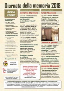 – ore 10.30 – a partire dal Cimitero Ebraico Percorso per le vie cittadine lungo le “pietre d’inciampo” che ricordano gli ebrei acquesi deportati nei lager – presso l’ex Tribunale – posa di una corona d’alloro in memoria dei partigiani fucilati