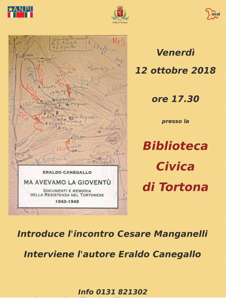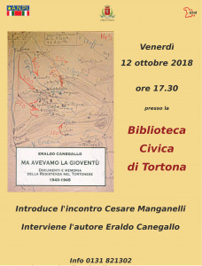 Venerdì 12 ottobre, alle ore 17.30 presso la Biblioteca Civica di Tortona, sarà presentato il volume di Eraldo Canegallo Ma avevamo la gioventù. Documenti e memoria della Resistenza nel tortonese 1943- 1945.