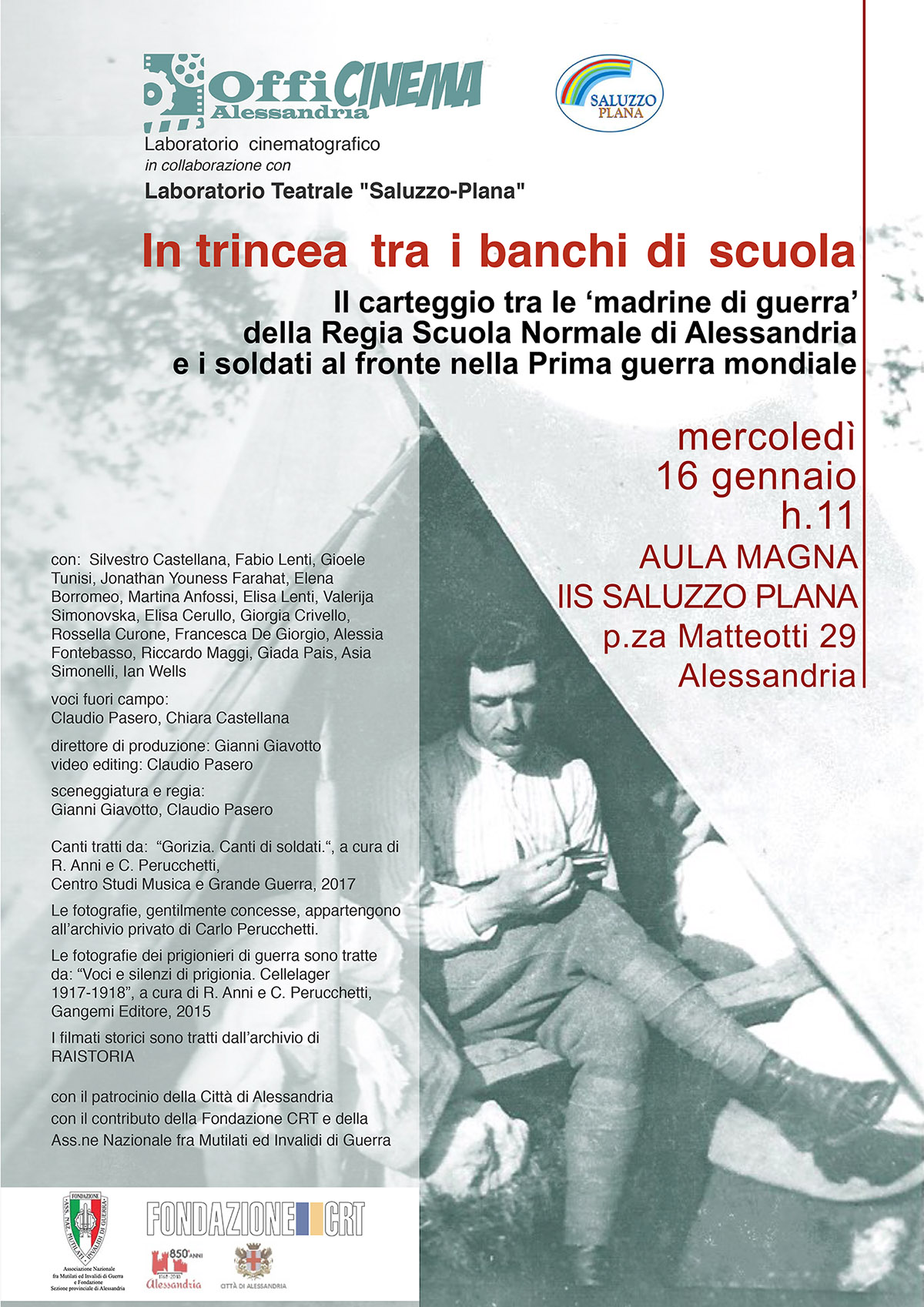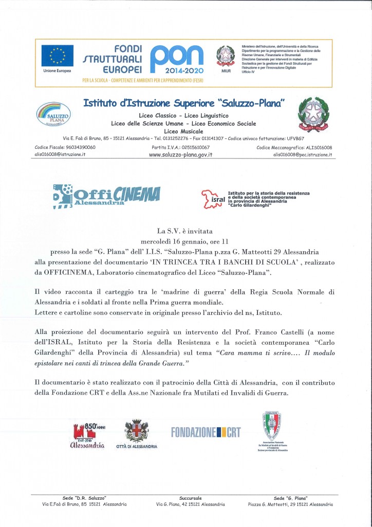 Mercoledì 16 gennaio prossimo, presso la sede “G. Plana” dell’ I.I.S. “Saluzzo-Plana” p.zza G. Matteotti 29 Alessandria sarà presentato il documentario IN TRINCEA TRA I BANCHI DI SCUOLA, realizzato da OFFICINEMA, Laboratorio cinematografico del Liceo “Saluzzo-Plana”