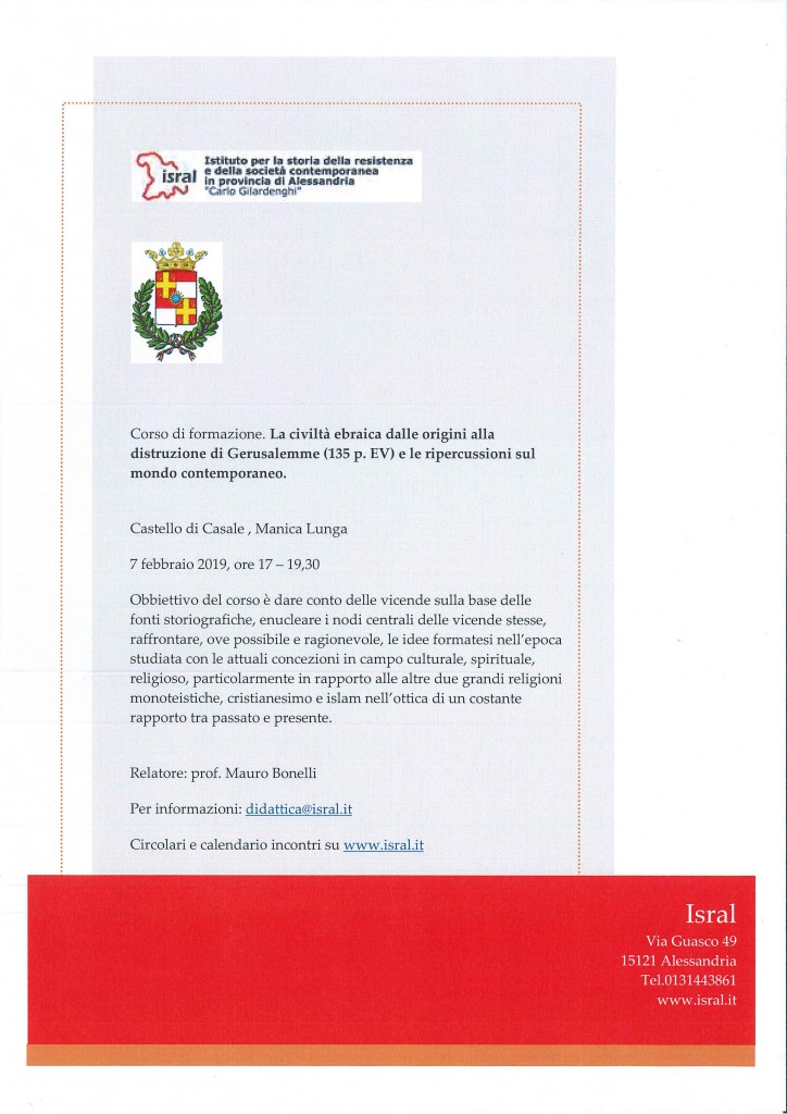 L’Isral, con il patrocinio del Comune di Casale Monferrato organizza un corso multidisciplinare aperto ai docenti delle scuole di ogni ordine e grado.