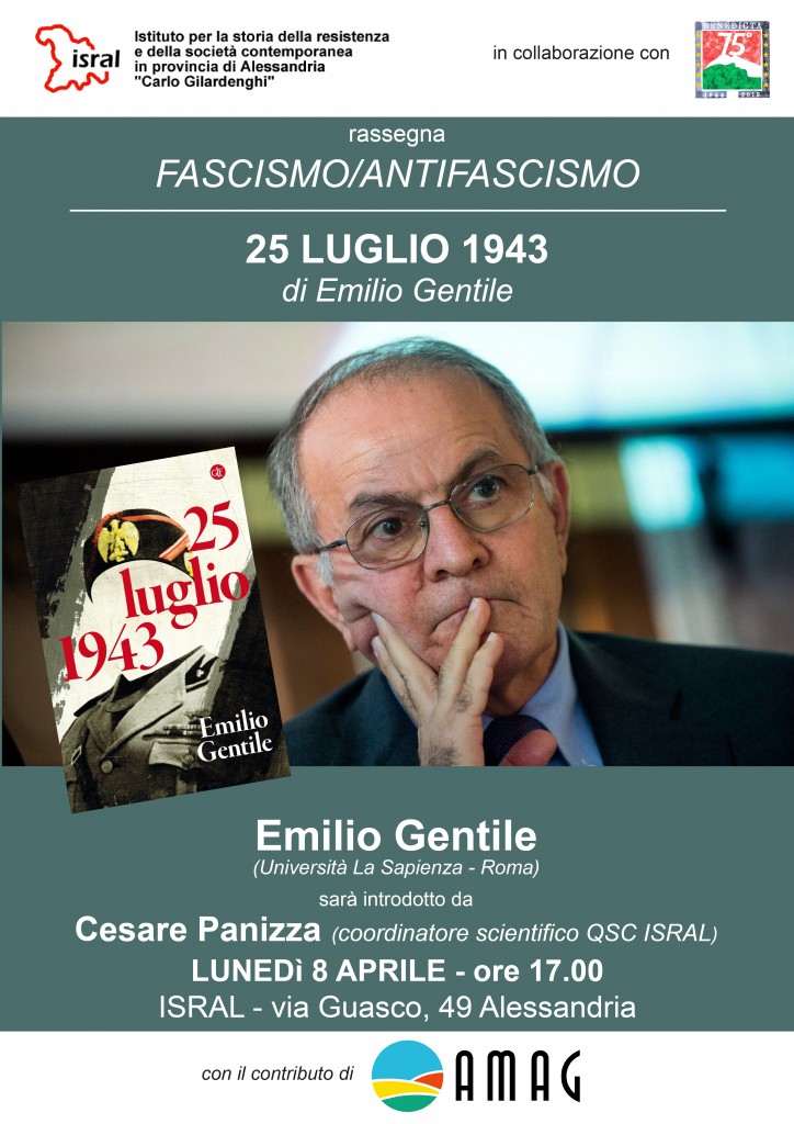 Lo storico Emilio Gentile, dell’Università “La Sapienza” di Roma, autore di 25 luglio 1943 dialogherà con Cesare Panizza dell’Isral.