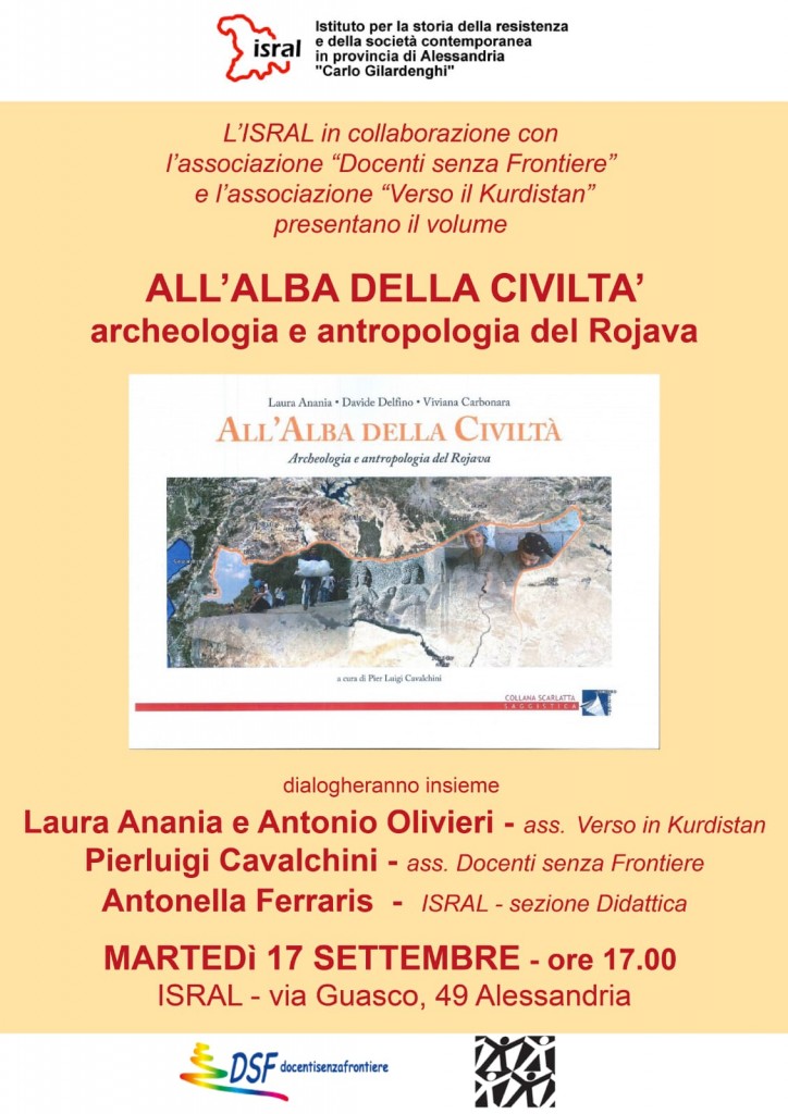 Martedì 17 settembre 2019, alle ore 17, nei locali dell’Isral in via dei Guasco 49, si terrà la presentazione del volume All’alba della civiltà. Archeologia e antropologia del Rojava, di Laura Anania, Davide Delfino e Viviana Carbonara (Genova, Cordero Editore, 2019).