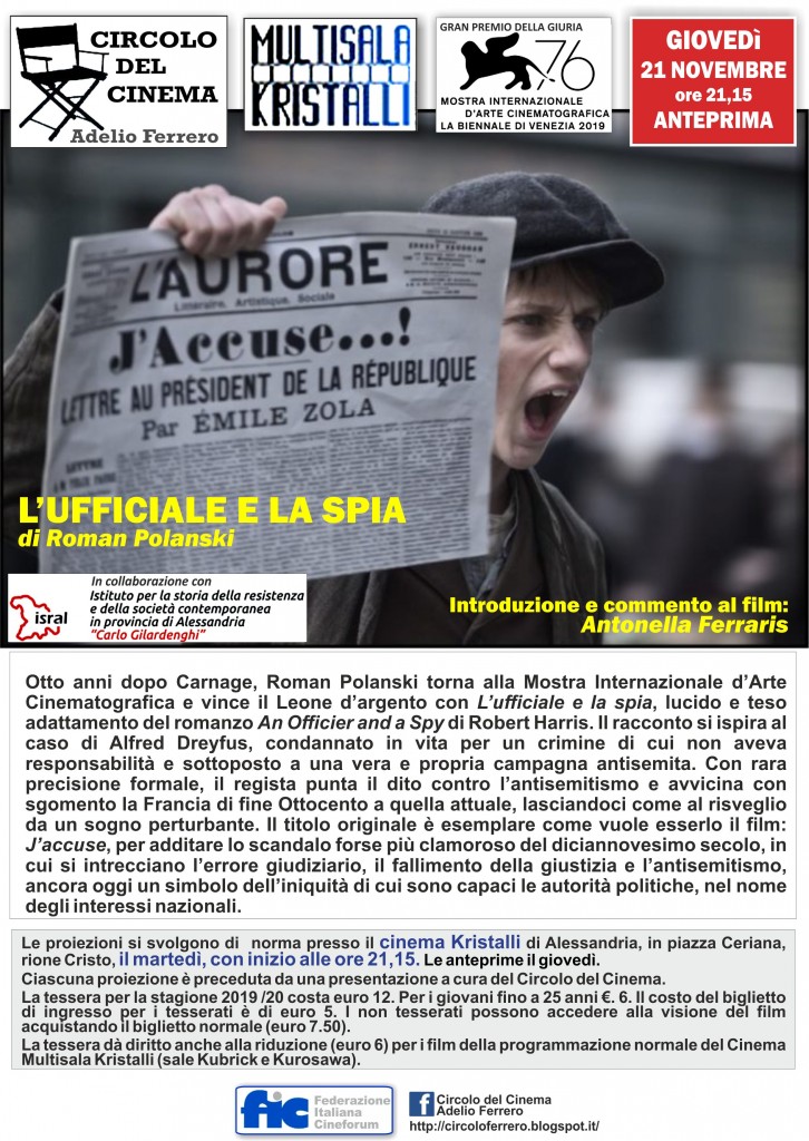 Giovedì 21 novembre il Circolo del Cinema Adelio Ferrero, in collaborazione con l‘ISRAL, presenta il nuovo film di Roman Polanski L’ufficiale e la spia e annuncia la retrospettiva dedicata al regista (martedì 3 dicembre, Il coltello nell’acqua – 1962; martedì 10 dicembre, L’inquilino del terzo piano – 1976).