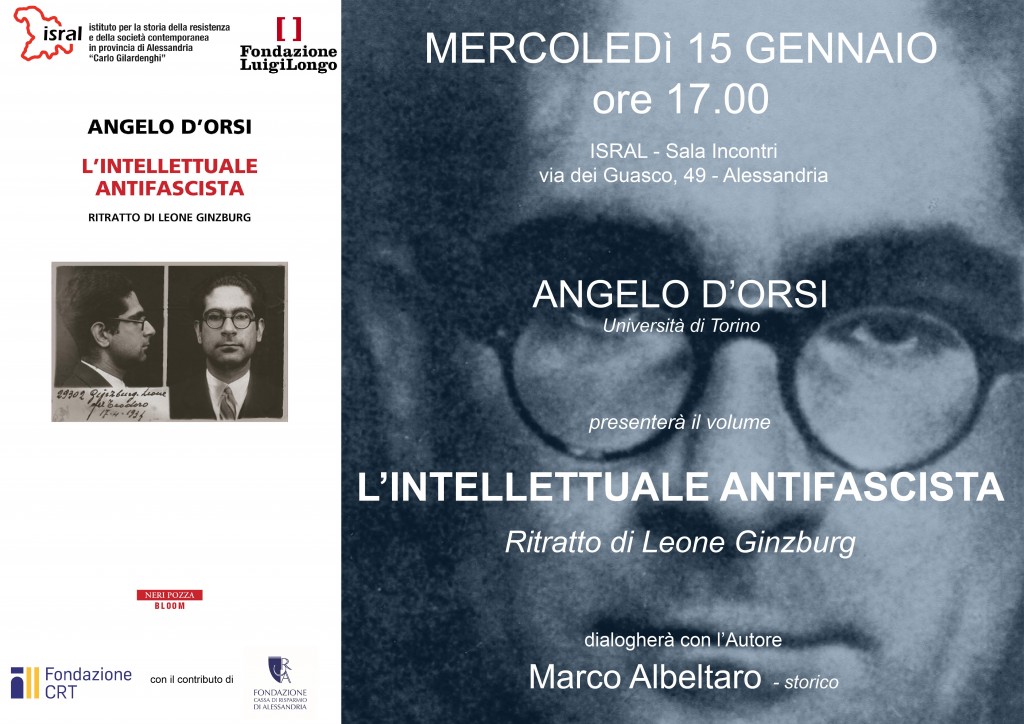 Mercoledì 15 gennaio, alle ore 17, nella sala incontri dell’Isral in via dei Guasco 49, sarà presentato l’ultimo libro di Angelo D’Orsi, L’intellettuale Antifascista. Ritratto di Leone Ginzburg (Neri Pozza 2019)