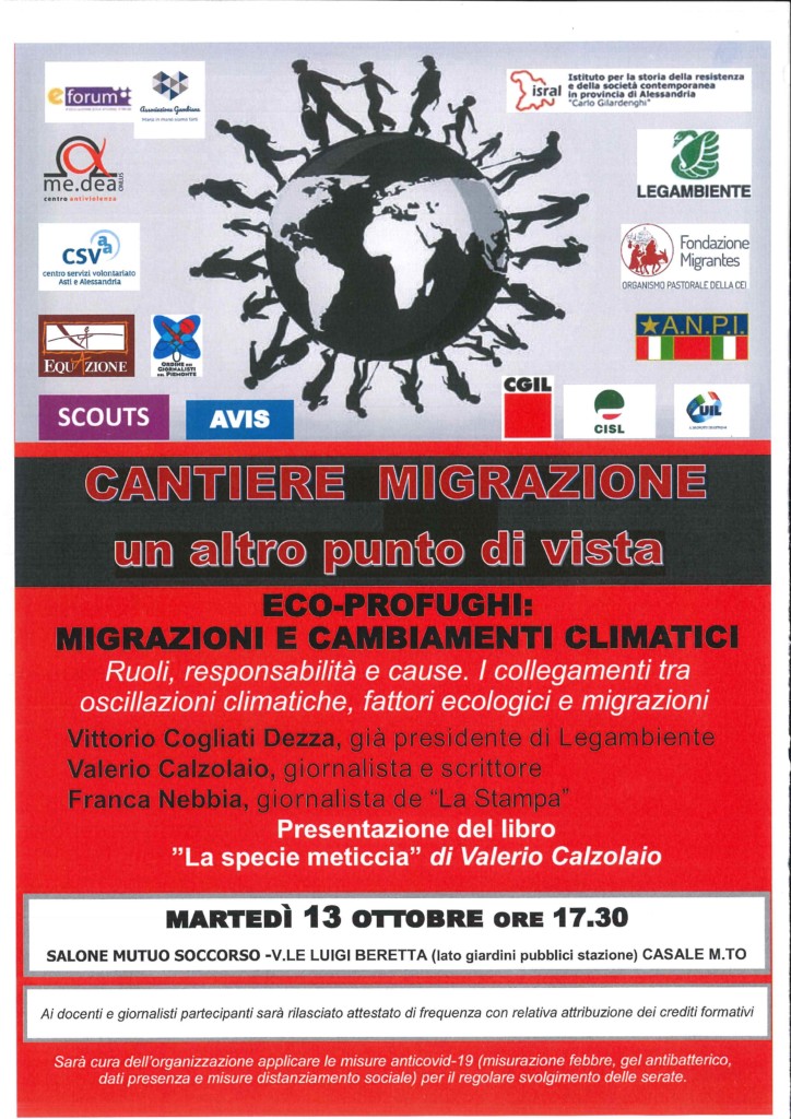 Martedì 13 ottobre alle ore 17,30, nei locali del Mutuo Soccorso, viale Luigi Beretta, Casale Monferrato, si svolgerà il secondo incontro del ciclo “Cantiere Migrazione, un altro punto di vista. Seconda edizione” promosso dal Tavolo Migrazione composto da eForum, Me.Dea. Centro Antiviolenza, Equazione, Scouts, Avis, Cgil, Cisl e Uil, Anpi, Fondazione Migrantes, Legambiente, Associazione Gambiana e Istituto per la Storia della Resistenza e della Società Contemporanea di Alessandria, con la collaborazione dell’Ordine dei Giornalisti del Piemonte e il sostegno del Centro Servizi Volontariato di Asti e Alessandria e con il patrocinio del Comune di Casale Monferrato.