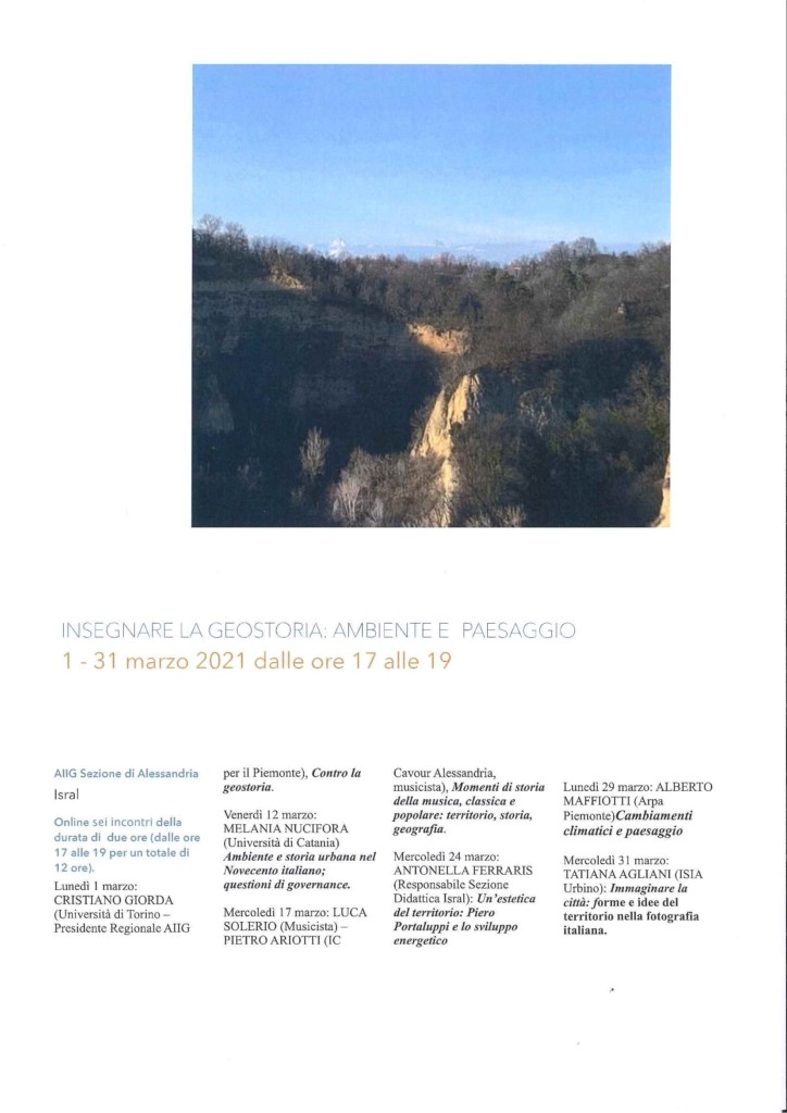 Il 1 marzo 2021 alle ore 17 prende il via il corso di formazione Insegnare la geostoria: Ambiente paesaggio, organizzato dall’Associazione Italiana Insegnanti di Geografia, sez. di Alessandria e dall’ISRAL, e che si terrà online sulla piattaforma Zoom dell’Isral.