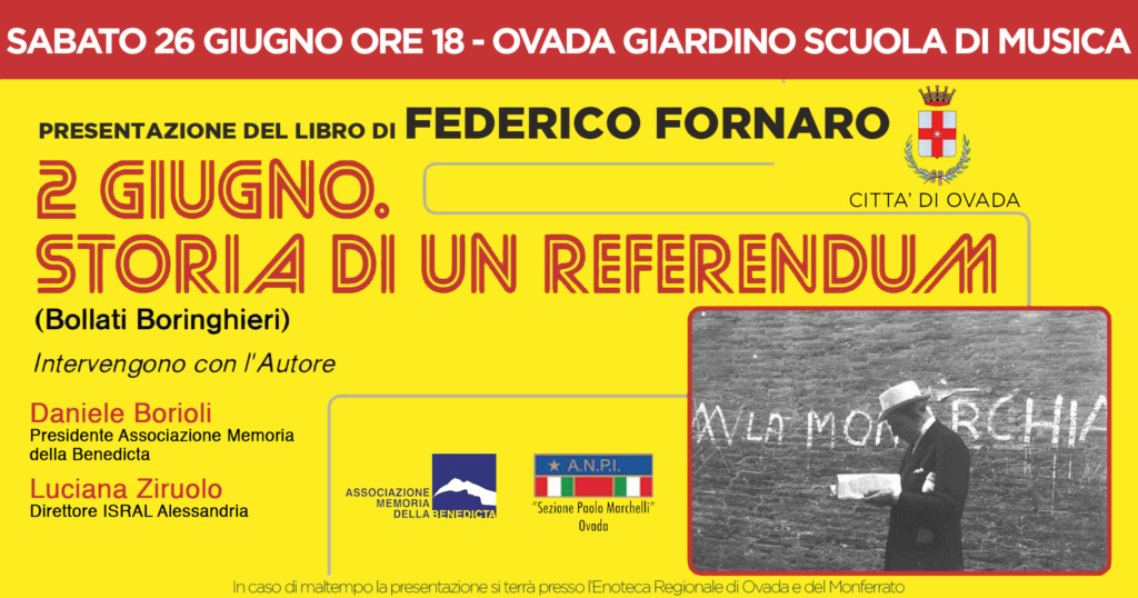 Sabato 26 giugno, alle ore 18, presso il Giardino Scuola di Musica a Ovada sarà presentato il nuovo libro di Federico Fornaro, 2 giugno 1946. Storia di un referendum (Bollati Boringhieri, 2021)