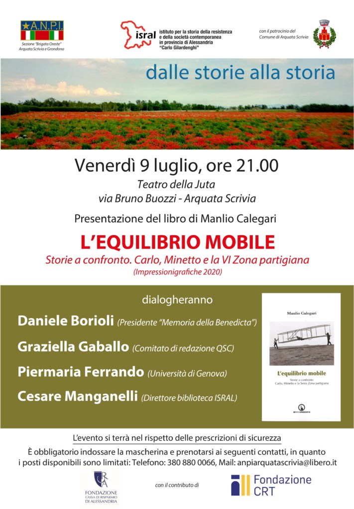 Dalle storie alla storia: venerdì 9 luglio, alle ore 21, presso il teatro della Juta di via Bruno Buozzi, ad Arquata Scrivia, sarà presentato il libro di Manlio Calegari, L’equilibrio mobile. Storie a confronto. Carlo, Minetto e la VI Zona partigiana (Acqui Terme 2020)