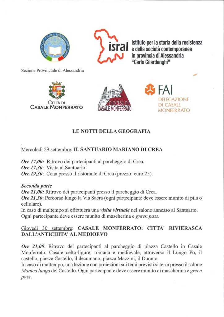 L’AIIG e l’ISRAL invitano insegnanti, studenti, studiosi, ricercatori, persone interessate all’iniziativa alle NOTTI DELLA GEOGRAFIA volte a valorizzare e godere paesaggi, scorci, in campagna e in città, emergenze storiche, culturali, artistiche, proponendo una nuova ed entusiasmante Geografia, strettamente legata alla storia. I luoghi diventano magici nel tardo pomeriggio e di notte.
