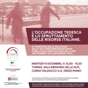 Il 14 dicembre prossimo, a Torino, presso la sala Memoria delle Alpi, corso Valdocco 4A, terzo piano, dalle ore 15,00 alle ore 18,30, si terrà il seminario L’occupazione tedesca e lo sfruttamento delle risorse italiane. Il Piemonte nelle relazione delle Militärkommandaturen e nella documentazione della Rsi (settembre 1943 -novembre 1944).