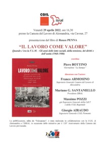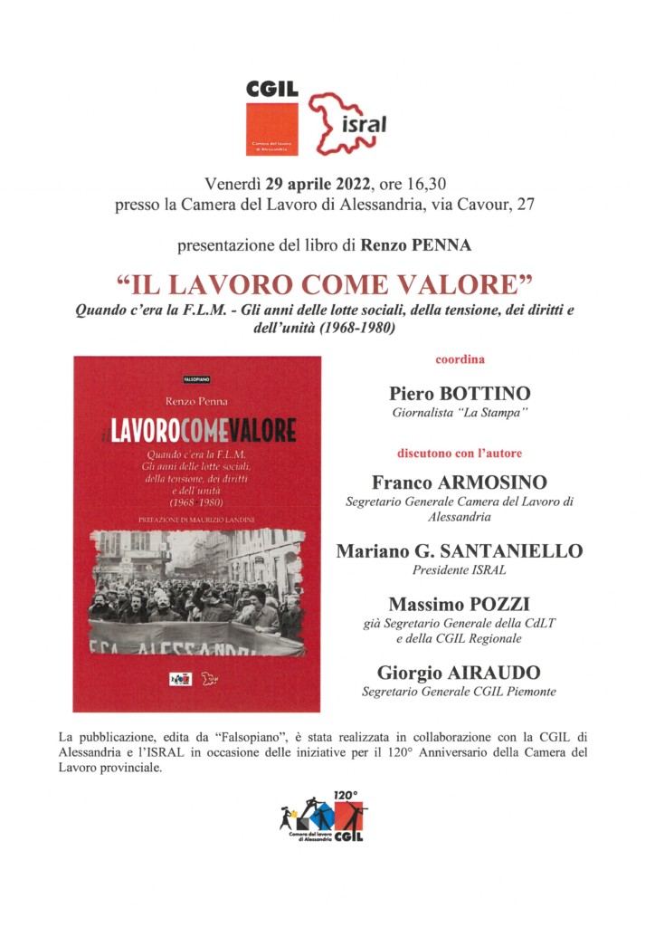 Nell’ambito delle iniziative per il 120° Anniversario della Camera del Lavoro di Alessandria, venerdì 29 aprile, alle ore 16,30, presso la Camera del Lavoro di Alessandria (via Cavour 27) si terrà la presentazione di Il Lavoro come Valore di Renzo Penna (Falsopiano, 2022).