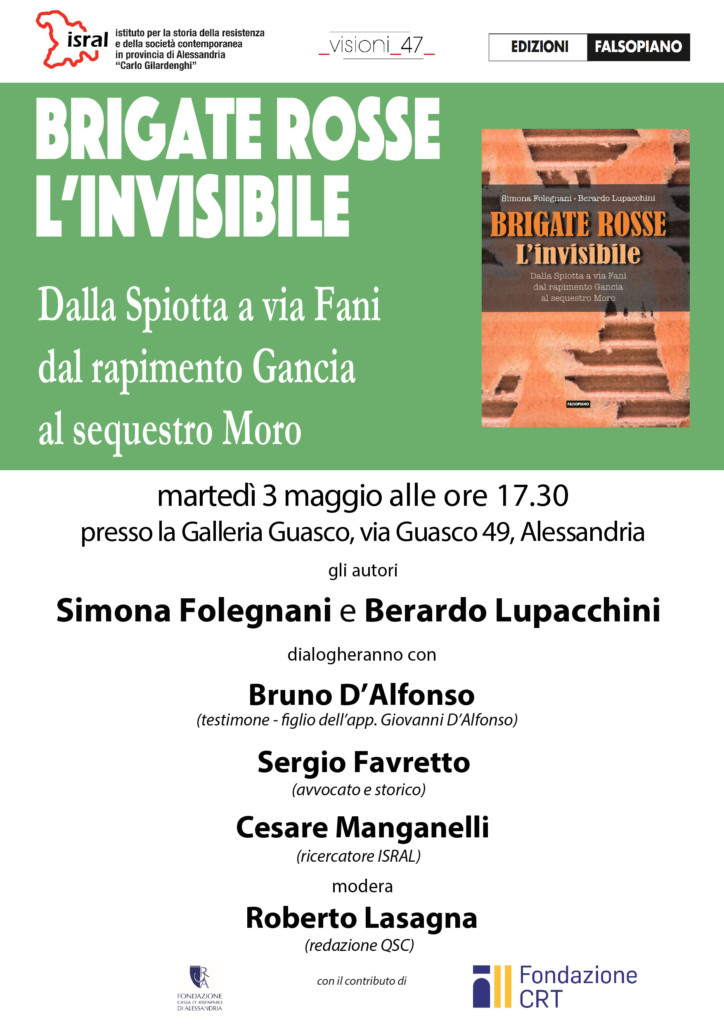 Martedì 3 maggio, alle ore 17,30, presso la Galleria Guasco (via Guasco 49, Alessandria) sarà presentato, in collaborazione con Falsopiano e Visioni 47, il libro di Simona Folegnari e Berardo Lupacchini L’Invisibile. Dalla Spiotta a via Fani, dal rapimento Gancia al sequestro Moro (Falsopiano, 2022)