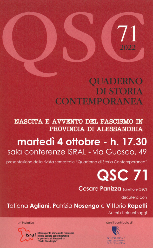 Martedì 4 ottobre, alle ore 17.30, nei locali del nostro istituto presenteremo il 71° “Quaderno di storia contemporanea”, rivista semestrale dell’ISRAL, intitolato Nascita e avvento del fascismo in provincia di Alessandria.
