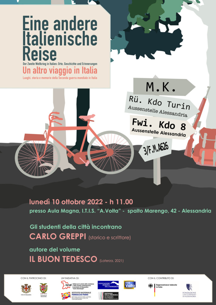 Nell’ambito delle iniziative che ruotano intorno alla mostra Un altro viaggio in Italia – Eine andere Italienische Reise, lo storico Carlo Greppi, autore del volume Il buon tedesco (Laterza, 2021) incontrerà gli studenti della città lunedì 10 ottobre prossimo, alle ore 11, presso l’aula magna dell’ITIS “Volta”, Spalto Marengo 42.