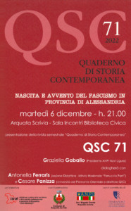 Martedì 6 dicembre, alle ore 21, presso la Sala incontri della Biblioteca Civica di Arquata Scrivia presenteremo il 71° “Quaderno di storia contemporanea”, rivista semestrale dell’ISRAL, intitolato Nascita e avvento del fascismo in provincia di Alessandria.