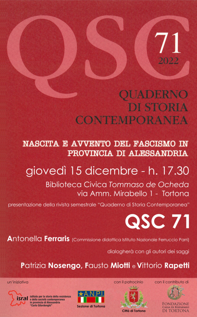 Giovedì 15 dicembre, alle ore 17.30, presso la Biblioteca Civica “Tommaso de Ocheda” di Tortona, via Amm. Mirabello 1, presenteremo il 71° “Quaderno di storia contemporanea”, rivista semestrale dell’ISRAL, intitolato Nascita e avvento del fascismo in provincia di Alessandria.