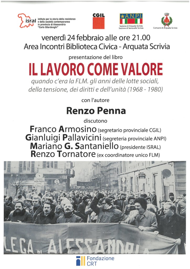 Venerdì 24 febbraio, alle ore 21, nell’Area Incontri della Biblioteca Civica di Arquata Scrivia sarà presentato il volume di Renzo Penna Il lavoro come valore. Gli anni delle lotte sociali, della tensione, dei diritti e dell’unità (1968 -1980) – (Falsopiano 2022).