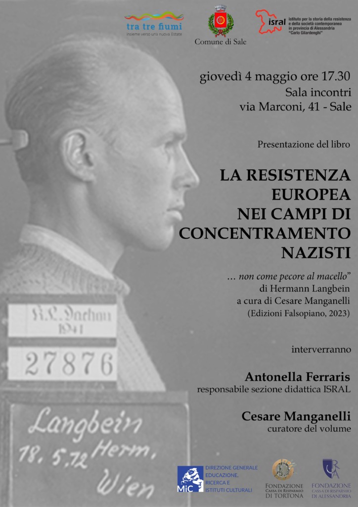 Giovedì 4 maggio alle ore 17,30, presso la sala incontri in via Marconi 41 a Sale si terrà la presentazione del volume La resistenza europea nei campi di concentramento nazisti. …non come pecore al macello di Hermann Langbein, a cura di Cesare Manganelli (Falsopiano, 2023), che ne discute con Antonella Ferraris, responsabile della Sezione didattica Isral