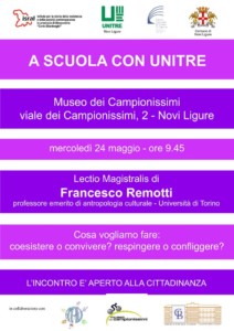 Domani mattina 24 maggio, alle ore 9.45, presso il Museo dei Campionissimi di Novi Ligure, viale dei Campionissimi 2, incontro con Francesco Remotti, professore emerito di Antropologia culturale dell’Università di Torino, dal titolo Cosa vogliamo fare? Coesistere o convivere? Respingere o confliggere? per confrontarsi sul modello di società che vogliamo.