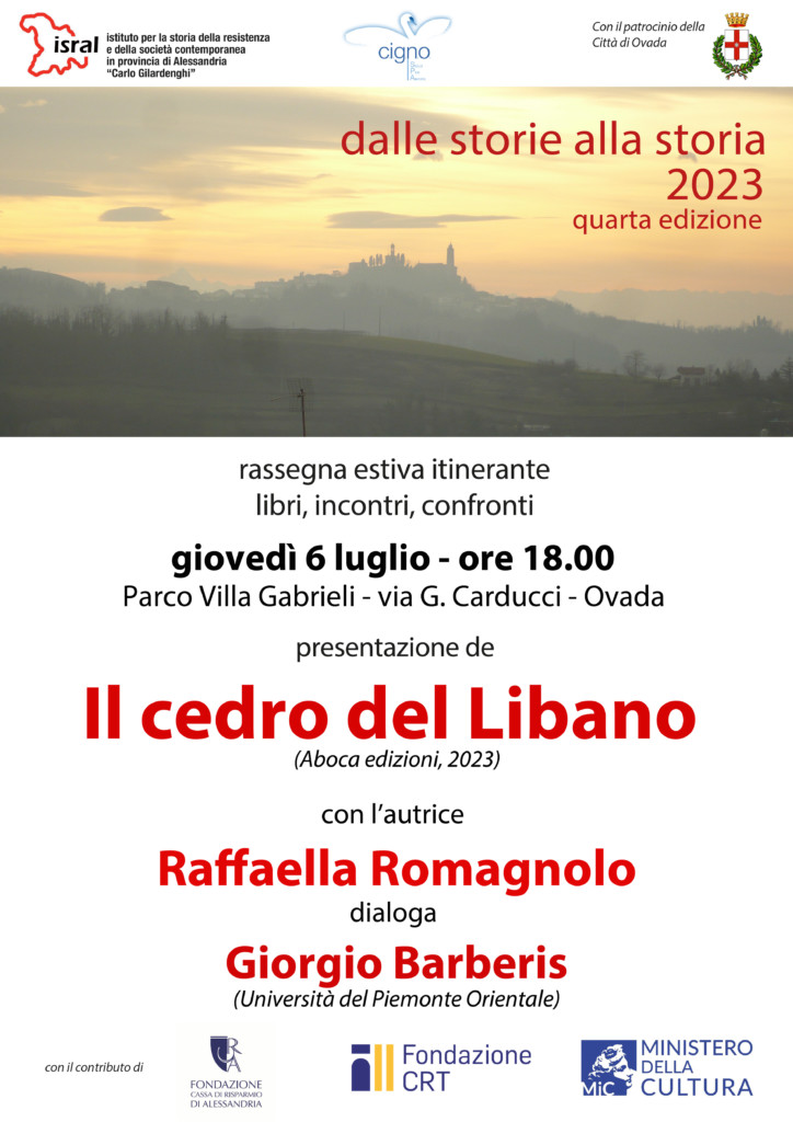La rassegna estiva dell’Isral di libri, incontri, confronti, Dalle storie alla storia prosegue giovedì 6 luglio alle ore 18, a Ovada, presso il Parco di Villa Gabrieli in via Carducci. Sarà presentato il libro di Raffaella Romagnoli Il cedro del Libano (Aboca edizioni, 2023); con l’autrice dialogherà Giorgio Barberis, dell’Università del Piemonte Orientale. In caso di pioggia l’evento si terrà presso il Convento dei Cappuccini, piazzetta dei Cappuccini 9.