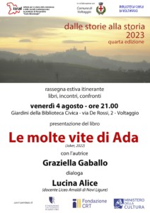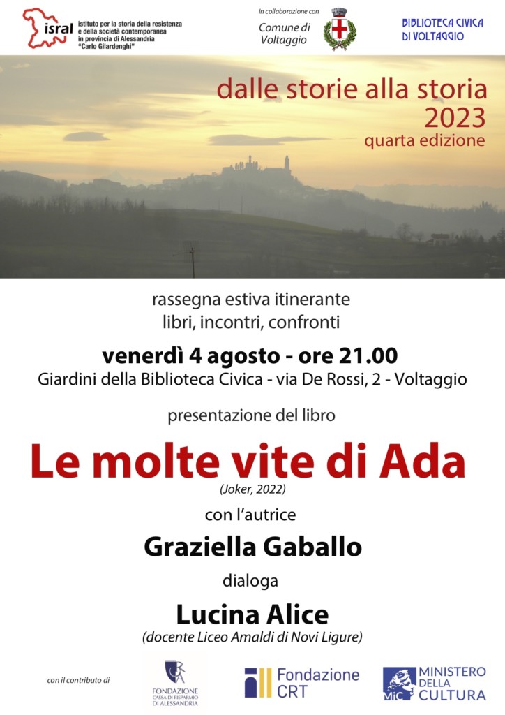 Venerdì 4 agosto alle ore 21 saremo a nei giardini della Biblioteca Civica di Voltaggio, via de Rossi 2, per presentare il libro di Graziella Gaballo Le molte vite di Ada (Joker 2022). Con l’autrice dialogherà la docente del Liceo “Amaldi” Lucina Alice.