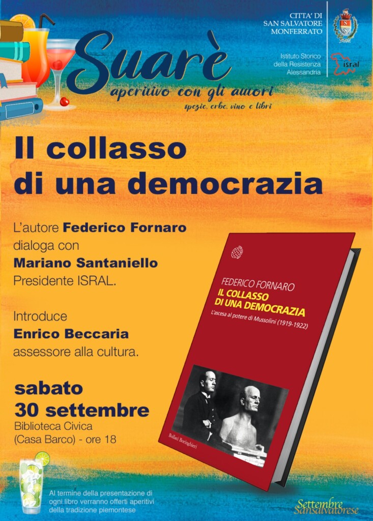 Sabato 30 settembre, alle ore 18 alla Biblioteca Civica di San Salvatore Monferrato (Casa Barco) Federico Fornaro presenterà il suo libro Il collasso di una democrazia. L’ascesa al potere di Mussolini (1919 – 1922) – (Bollati Boringhieri, 2022). Con l’autore dialogherà Mariano Santaniello, presidente dell’Isral. Introduce l’Assessore alla Cultura Enrico Beccaria