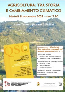 Martedì 14 novembre 2023, alle ore 17,30 , a Palazzo Robellini, Acqui Terme, avrà luogo la presentazione del 73° numero del «Quaderno di storia contemporanea». Intitolato Monti, fossi e filari. Agricoltura e paesaggio in provincia di Alessandria, il «Quaderno» ricostruisce la storia dell’agricoltura alessandrina in età contemporanea. Le grandi trasformazioni dell’agricoltura registrate nel corso degli ultimi due secoli sono analizzate in prospettiva storica e con una particolare attenzione alle incognite che gravano sul futuro della nostra agricoltura di fronte all’impatto dei cambiamenti climatici.