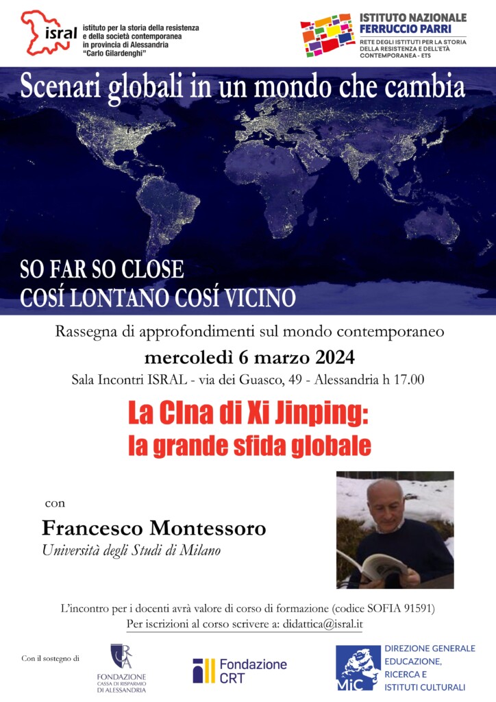 Il 6 marzo alle ore h. 17.00, presso la sala incontri dell’Isral in via dei Guasco 49 , Francesco Montessoro (Università Statale Milano) discuterà su La Cina di Xi Jinping: la grande sfida globale.