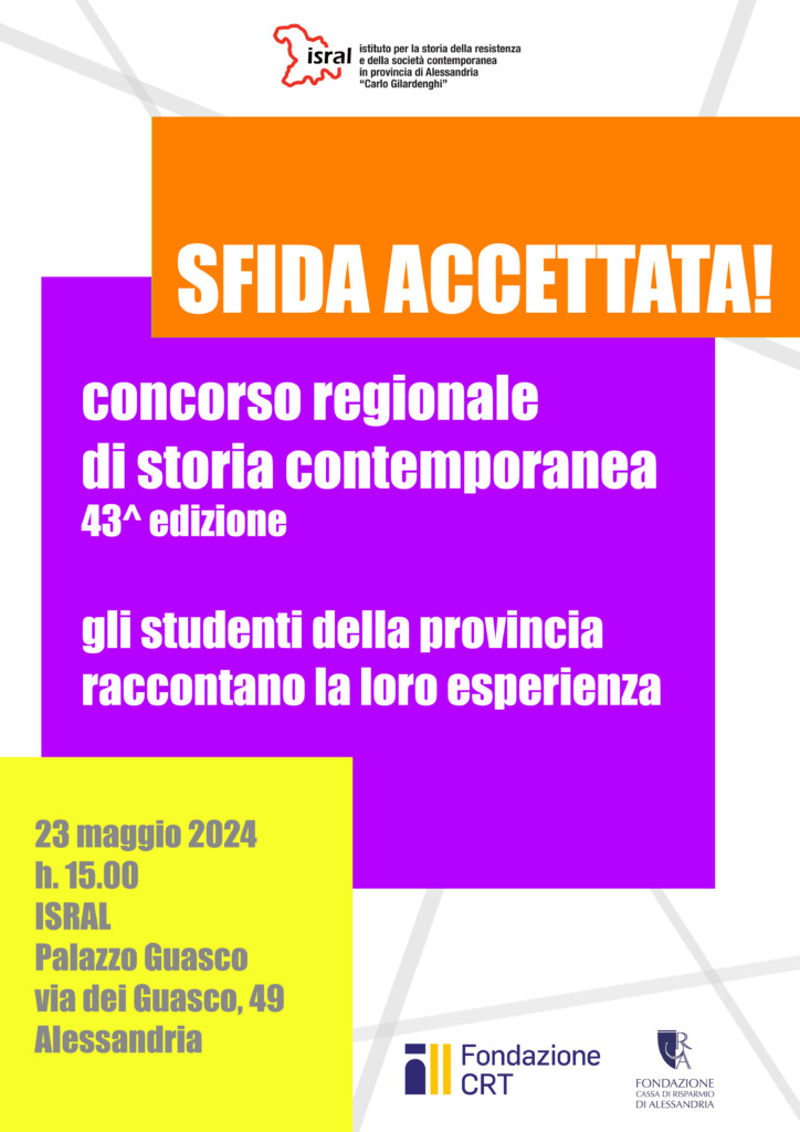 Giovedì 23 maggio, alle ore 15, nella Sala Incontri dell’Isral, via Guasco 49 Alessandria, gli studenti degli Istituti superiori della provincia di Alessandria che hanno partecipato alla 43° edizione del Concorso di storia contemporanea indetto come ogni anno dal Comitato Resistenza e Costituzione del Consiglio regionale del Piemonte si incontreranno per parlare della loro esperienza. La partecipazione degli studenti della provincia di Alessandria, quest’anno, è stata cospicua e di altissimo livello generale, come riconosciuto dalla Commissione esaminatrice.