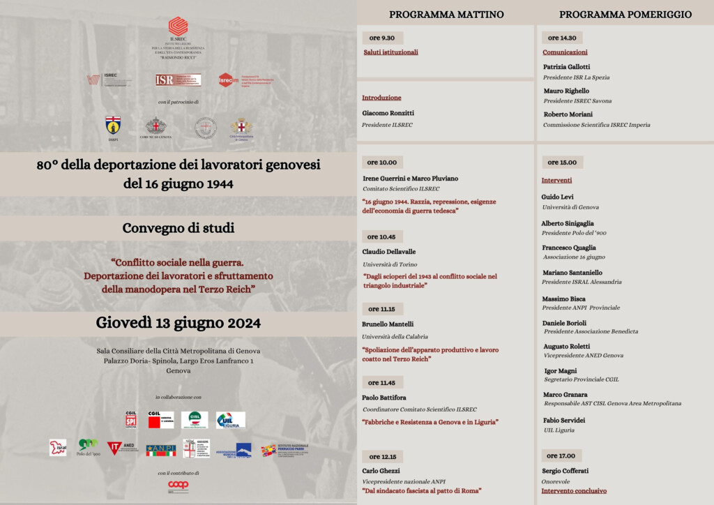 Giovedì 13 giugno p.v. a partire dalle ore 9.30 a Palazzo Doria-Spinola, nella la Sala Consiliare della Città Metropolitana di Genova, Largo Eros Lanfranco 1, si terrà il convegno 80° della deportazione dei lavoratori genovesi del 16 giugno 1944.