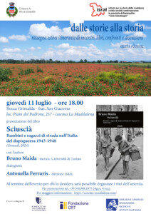 La rassegna estiva dell’Isral Dalle storie alla storia prosegue giovedì 11 luglio alle ore 18 presso Cascina “La Maddalena”, fraz. San Giacomo di Roccagrimalda: sarà presentato il nuovo libro di Bruno Maida Sciuscià. Bambini e ragazzi di strada nell’Italia del dopoguerra 1943-1948 (Einaudi, 2024) In dialogo con l’autore, Antonella Ferraris, direttrice dell’Isral