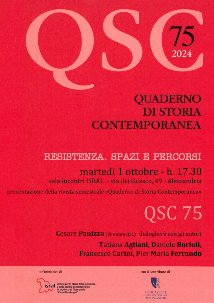 Martedì 1° ottobre, alle 17.30, nei locali del nostro istituto, avrà luogo la presentazione del 75° Quaderno di storia contemporanea, intitolato Resistenza. Spazi e percorsi. All’incontro, coordinato da Cesare Panizza, parteciperanno Tatiana Agliani, storica della fotografia, Daniele Borioli, storico e presidente dell’Associazione Memoria della Benedicta, Francesco Carini, giornalista e studioso di cinema, e Pier Maria Ferrando, già professore ordinario di Economia Aziendale presso l’Università di Genova.