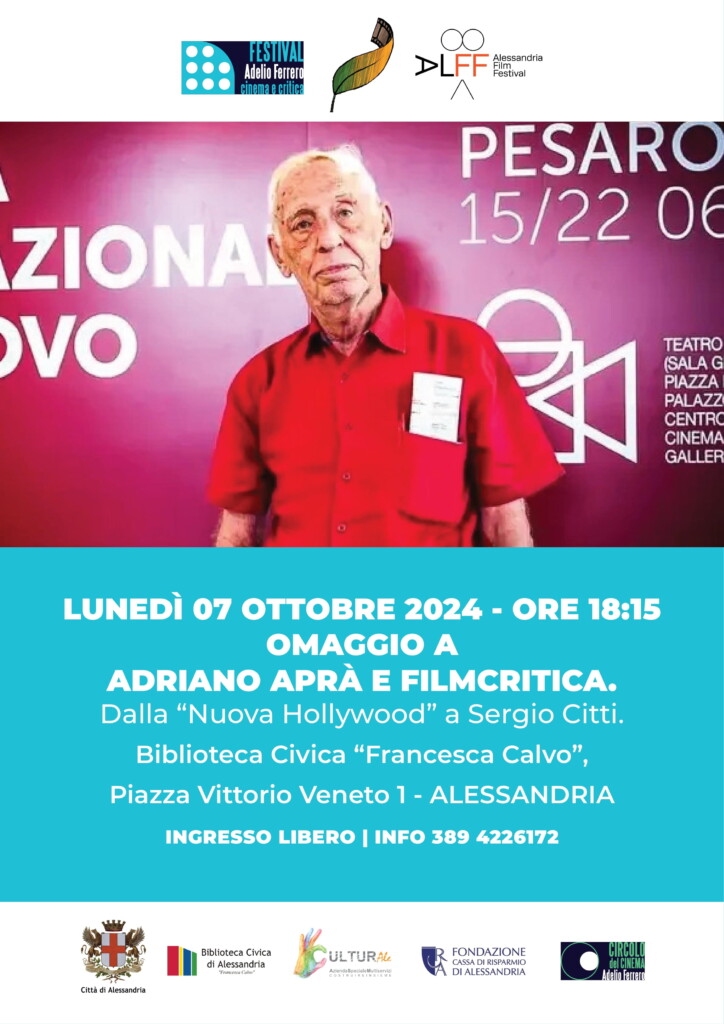 Un appuntamento del Festival Adelio Ferrero nel calendario di “Ottobre Alessandrino – Mese del Cinema” dedicato al ruolo e alla funzione storica della critica cinematografica, all’evoluzione e alle tappe principali del dibattito sul cinema, attraverso l’omaggio ad Adriano Aprà, grande critico e storico del cinema recentemente scomparso, e l’incontro con la redazione di “Filmcritica”, storica e fondamentale rivista di critica cinematografica. Adriano Apra’ e “Filmcritica” saranno i protagonisti di un appuntamento dedicato a tutti gli appassionati del cinema e della riflessione attorno alla settima arte, realizzato anche con la collaborazione con l’Istituto per la Storia della Resistenza della Provincia di Alessandria (ISRAL). Adriano Aprà è stato un critico, saggista, organizzatore culturale, che con la sua visione ha contribuito a innovare il modo di interpretare il cinema, diventando, grazie alla rivista “Cinema & Film” che contribuì a fondare, alle molte pubblicazioni, ai lavori di restauro, alla direzione del Filmstudio di Roma, a quella dei Festival di Salsomaggiore e di Pesaro, un punto di riferimento fondamentale per la cultura cinematografica e la Nuova critica del film.