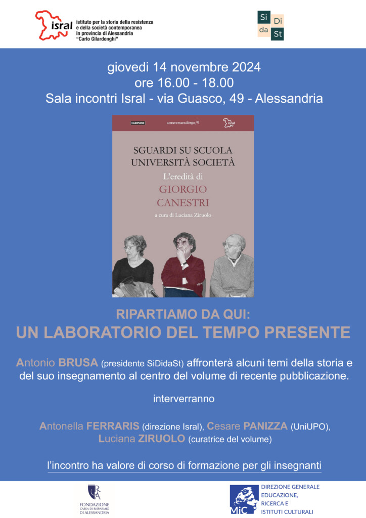 Giovedì 14 novembre dalle ore 16 alle ore 18 presso la sala incontri dell’Isral in via Guasco 49, Alessandria il prof. Antonio Brusa presidente SiDidaSt affronterà alcuni temi dell’insegnamento della storia al centro del volume in dialogo con la prof.ssa Antonella Ferraris (direttrice Isral e responsabile sezione didattica), del prof. Cesare Panizza (responsabile scientifico Isral) e della prof.ssa Luciana Ziruolo (già direttrice Isral e curatrice del volume).