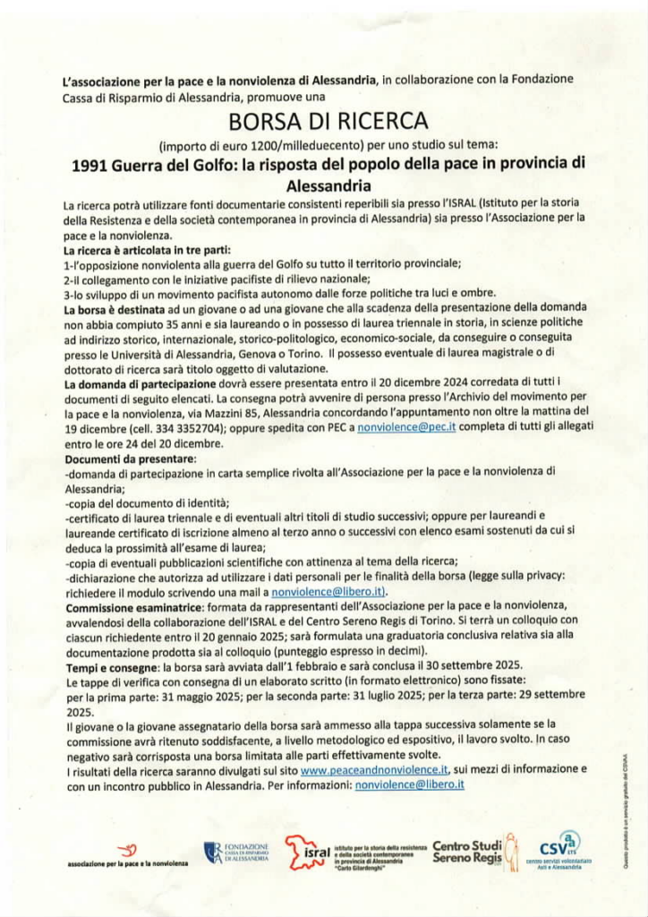 Borsa di ricerca dell’Associazione per la pace e la non violenza di Alessandria