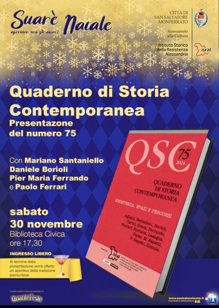 Sabato 30 novembre alle ore 17.30, presso la Biblioteca civica di San Salvatore Monferrato, sarà presentato il n. 75 di “QSC Quaderno di storia contemporanea”, Resistenza. Spazi e percorsi.