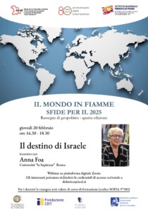 Il secondo incontro sarà giovedì 20 febbraio 2025 alle 16.30: Anna Foa (Università la Sapienza-Roma), che sarà presente da remoto, discuterà con Cesare Panizza (Uniupo) su Il destino di Israele, a partire dal suo ultimo libro.