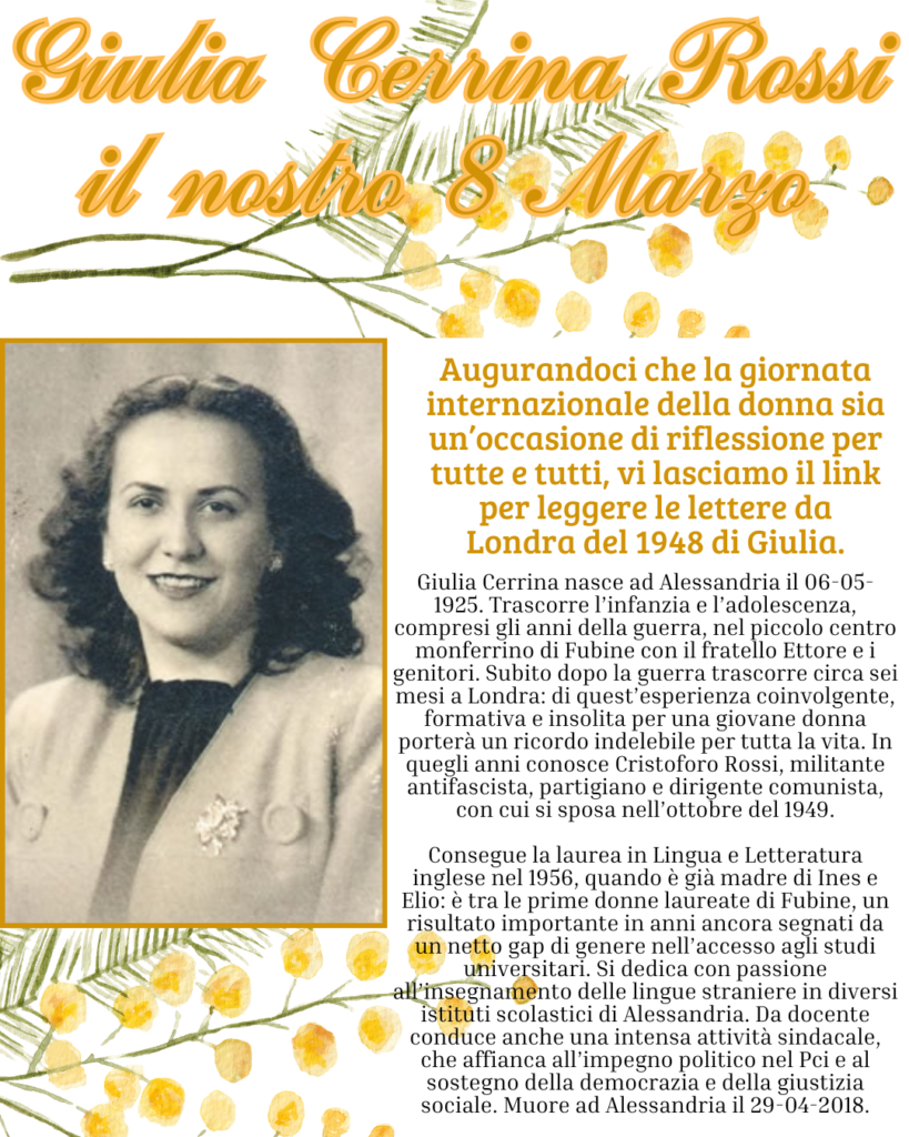Giulia Cerrina nasce ad Alessandria il 6 maggio 1925. Trascorre l’infanzia e l’adolescenza, compresi gli anni della guerra, nel piccolo centro monferrino di Fubine con il fratello Ettore e i genitori. Terminato l’Istituto Magistrale, si iscrive alla Facoltà di Lingue Straniere dell’Università degli studi di Genova, dove ha l’opportunità di seguire, tra le altre, le lezioni di Mario Praz, uno dei migliori anglisti della sua generazione. Subito dopo la guerra trascorre circa sei mesi a Londra: di quest’esperienza coinvolgente, formativa e insolita per una giovane donna proveniente da una famiglia di modeste condizioni economiche – documentata nelle lettere inviate alla famiglia – porterà un ricordo indelebile per tutta la vita. In quegli anni conosce a Fubine, dove era rientrato dopo sette anni di confino, Cristoforo Rossi – militante antifascista, partigiano e dirigente comunista – al quale si unisce in matrimonio nell’ottobre del 1949.