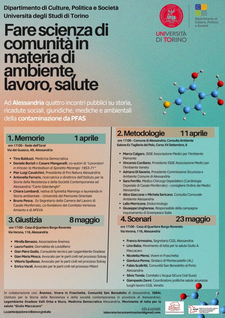 - «Workshop Giustizia» (giovedì 8 maggio 2025, h 17:00, Casa di Quartiere Borgo Rovereto via Verona, 116, Alessandria) con avvocati, giornalisti e organizzazioni civiche attive sulle contaminazioni da Pfas.