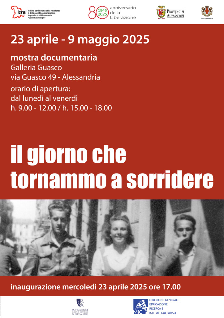Mercoledì 23 aprile 2025 alle ore 17 l’Isral inaugurerà la mostra documentaria “Il Giorno che tornammo a sorridere” presso Galleria Guasco in via Guasco 49, Alessandria. La mostra è stata realizzata in occasione delle celebrazioni per l’80 anniversario della Liberazione grazie al materiale fotografico e documentario posseduto dall’archivio Isral e a cimeli e oggettistica provenienti dall’Anpi di Alessandria, Anpi di Ovada – sezione “Paolo Marchelli”, dal Memoriale dei partigiani pontecuronesi, dal Museo della Resistenza del Monferrato di Camagna e dal Museo della Resistenza e della Vita sociale in val Borbera “C.B. Lazagna” di Rocchetta Ligure. Tra gli oggetti esposti al pubblico anche la giubba militare indossata da Don Berto Ferrari, cappellano della divisione “Mingo” e i guanti adatti al combattimento di Fjodor Poletaev, medaglia d’oro al Valor Militare per il sacrificio tributato nel combattimento della battaglia di Cantalupo Ligure il 2 febbraio 1945. La mostra rimarrà poi aperta al pubblico fino al 9 maggio 2025 dal lunedì al venerdì dalle 9 alle 12 e dalle 15 alle 18.