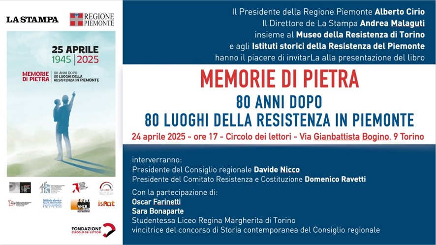 Il 25 aprile, allegato gratuitamente al quotidiano “La Stampa”, uscirà il volume 25 aprile 1945-2025. Memorie di pietra. 80 anni dopo. 80 luoghi della Resistenza in Piemonte, realizzato dal Museo diffuso della Resistenza in collaborazione con gli Istituti storici della Resistenza del Piemonte.