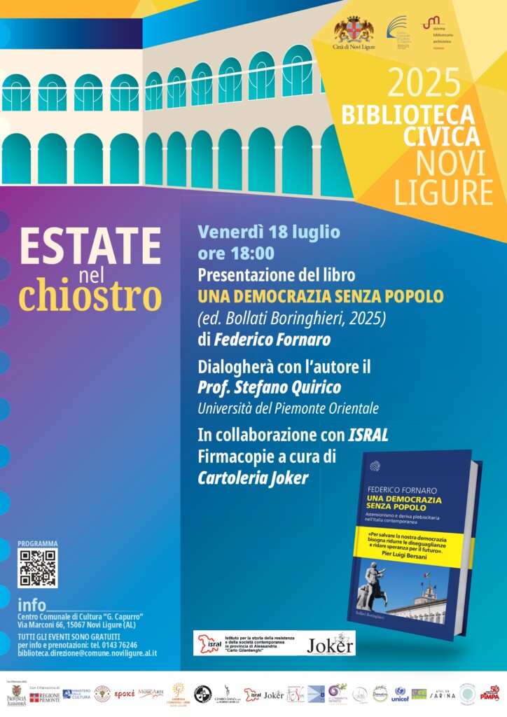 Si segnala la presentazione del libro di Federico Fornaro “Una democrazia senza popolo” (ed. Bollati Boringhieri, 2025) venerdì 18 luglio ore 18,00 presso il Chiostro della Biblioteca Civica di Novi Ligure. Il libro cerca di tirare le fila e comprendere le problematiche inerenti l’astensionismo e la deriva plebiscitaria nell’Italia contemporanea. Dialogherà con l’autore il prof. Stefano Quirico dell’Università del Piemonte Orientale.