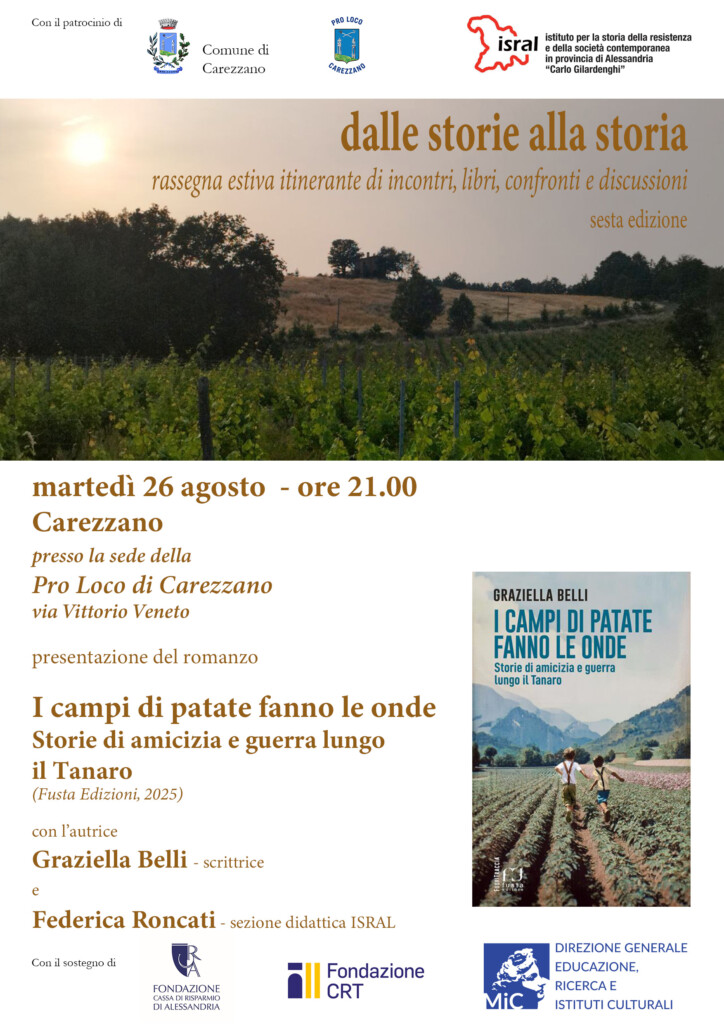 La rassegna Isral “Dalle storie alla storia” proseguirà il 26 agosto a Carezzano, alle ore 21, presso i locali della ProLoco in via Vittorio Veneto, con il romanzo di Graziella Belli, I campi di patate fanno le onde. Storie di amicizia e guerra lungo il Tanaro (Fusta editore 2025). Con l’autrice dialogherà Federica Roncati, ricercatrice Isral.