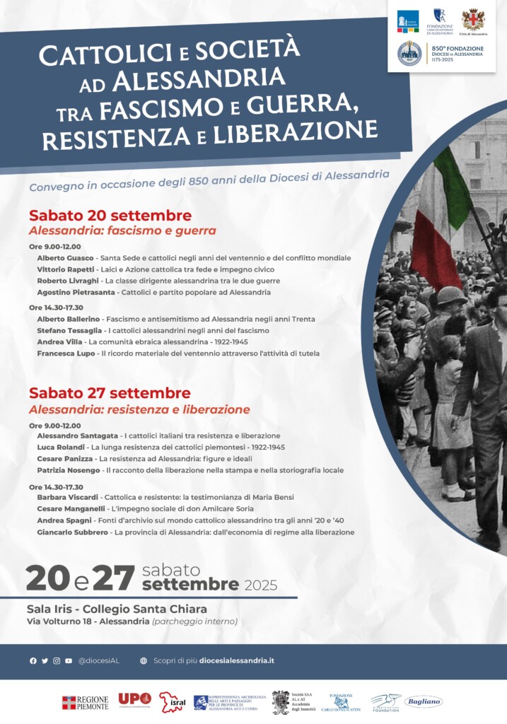 Si segnala il convegno “Cattolici e società ad Alessandria tra fascismo e guerra, resistenza e liberazione” in occasione degli 850 anni della Diocesi di Alessandria presso Sala Iris – Collegio Santa Chiara in via Volturno 18, Alessandria.